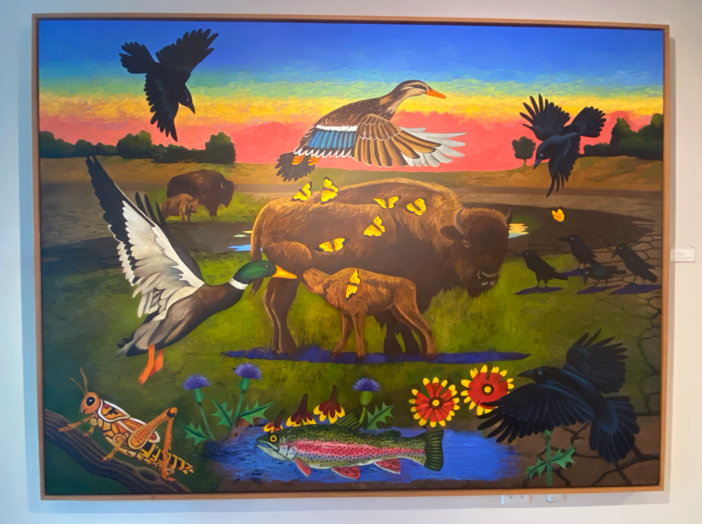 If you’ve read this far, you can probably see commonalities in the art that stands out to me. Work by artist Billy Hassell is no exception. I first learned about him from a museum in Beaumont that I follow, and was disappointed that I couldn’t get there in time to see his exhibition. So, I was extremely happy to see that he was exhibiting work in Irving soon after. In this particular piece, I liked the colors and the delicate butterflies against the strong bison. The way that the animals are grouped seem peaceful, and goodness knows we can all use as much of that as we can get.