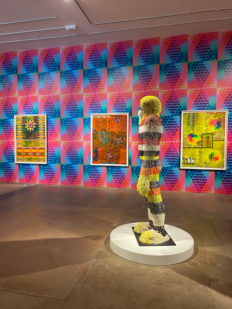 I’ve seen Jeffrey Gibson’s work three times in three different states: at the 2019 Whitney Biennial in NYC, at the Blanton in Austin and now at Site Santa Fe. If there’s an exhibit of Gibson’s work that I can reasonably get to, I try my best. I love how his work spans such diverse media and genre to tell the many stories of his life and culture, and specifically how his bead and textile work adds such depth and tactile presentation, bringing his work to life even further.