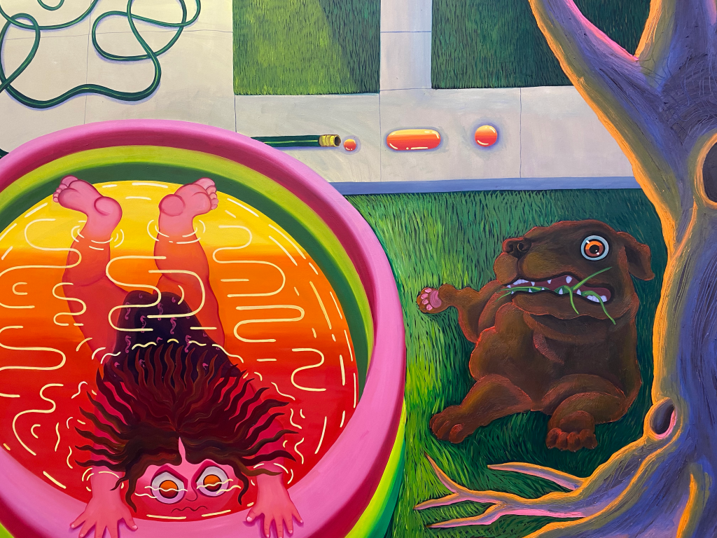 I gravitate toward juxtaposition of bright and cool colors, which give the paintings kind of a whimsical, otherworldly glow effect. I also create some figures in more detail than others, which places my “characters” within a greater community. I also make sure there’s a little dog with a curly tail somewhere in there, representing my childhood dog Tater (1980-1997) who was always in the mix and lived long enough to bear witness to many life and community milestones.