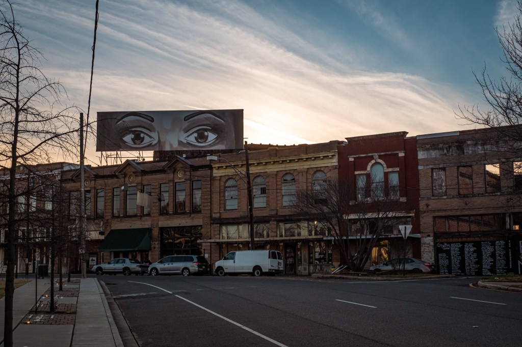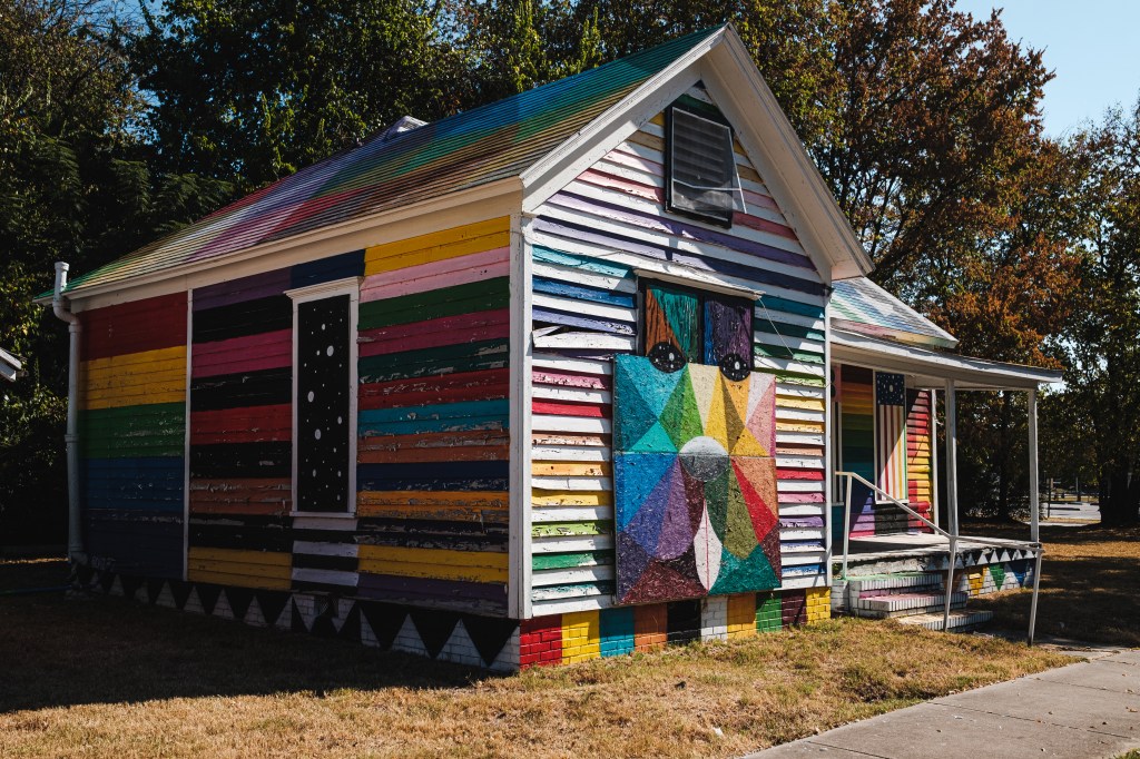 Fort Smith, Arkansas is a public art town, with murals on almost every side surface — and some silos — all throughout its downtown. “Rainbow Embassy,” by Spanish artist Okuda San Miguel is a multidimensional piece, its vibrant stripes and colors splashing not just one wall, but many walls, the roof and the porch, and extending to an equally colorful accessory building. “Rainbow Embassy” is installed in the middle of a residential neighborhood just outside of downtown. Set among the homes, cars and yard ephemera of the surrounding blocks, it both enhances the neighborhood and serves as a bright, unassuming statement piece that all can enjoy.