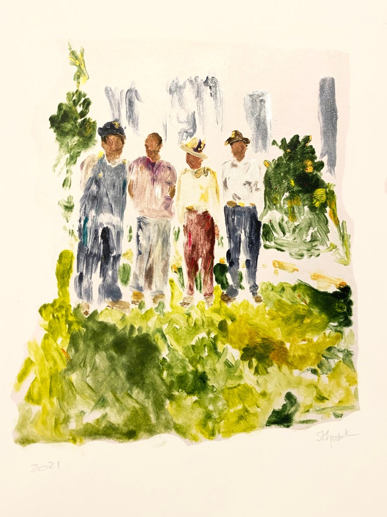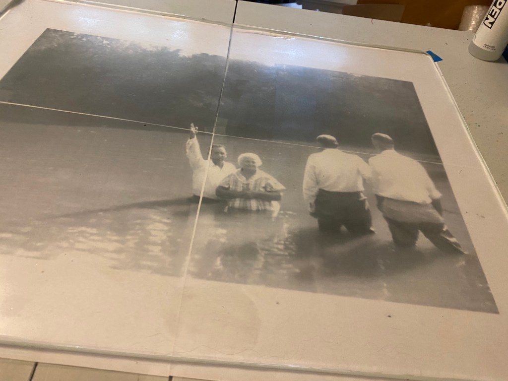 I’ve started working on larger monotype prints, which is fun. It takes a little bit of problem solving, since I don’t have a large format printer and wouldn’t want to spend money to have something printed professionally that’s just going to be a reference piece. So, in order to get the photo large enough, I open Adobe Acrobat and print as a poster, which enlarges across multiple sheets of paper. I put them together sort of like a puzzle under my large plate (or plates if the finished product will be larger than 16X20.) It is a little extra work, but I love how these look at a larger scale when I can bring out more of the entire scene.