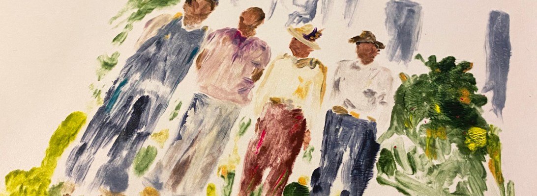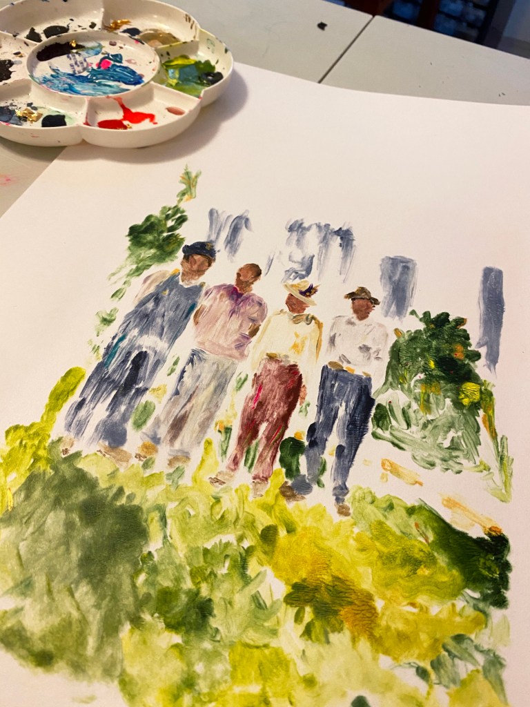 This is another large piece in progress, inspired by a photo from The History Center, of Lufkin Dunbar High School’s marching band performing at a Christmas parade in 1965. So much to like about this photo that I wanted to capture – the uniforms, the mod-looking building behind the crowd. and while it is hard to see here, the Christmas decorations in the background.