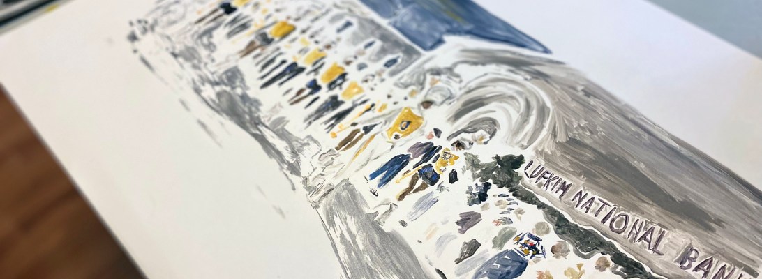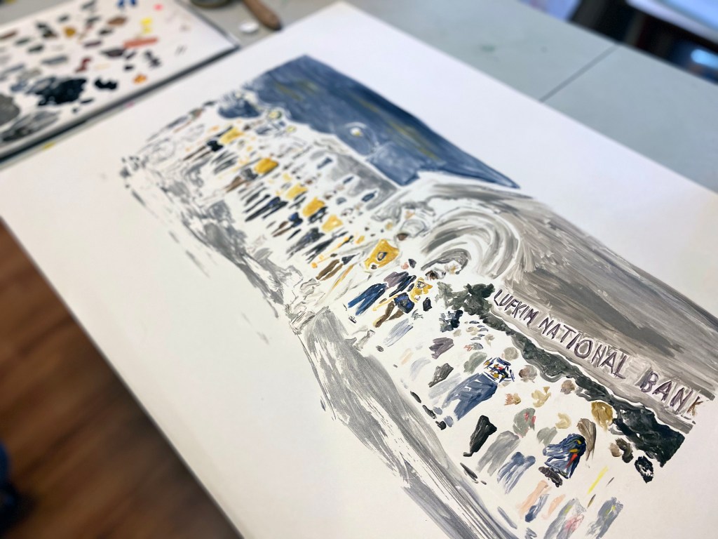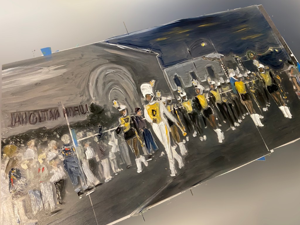This is another large piece in progress, inspired by a photo from The History Center, of Lufkin Dunbar High School’s marching band performing at a Christmas parade in 1965. So much to like about this photo that I wanted to capture – the uniforms, the mod-looking building behind the crowd. and while it is hard to see here, the Christmas decorations in the background.