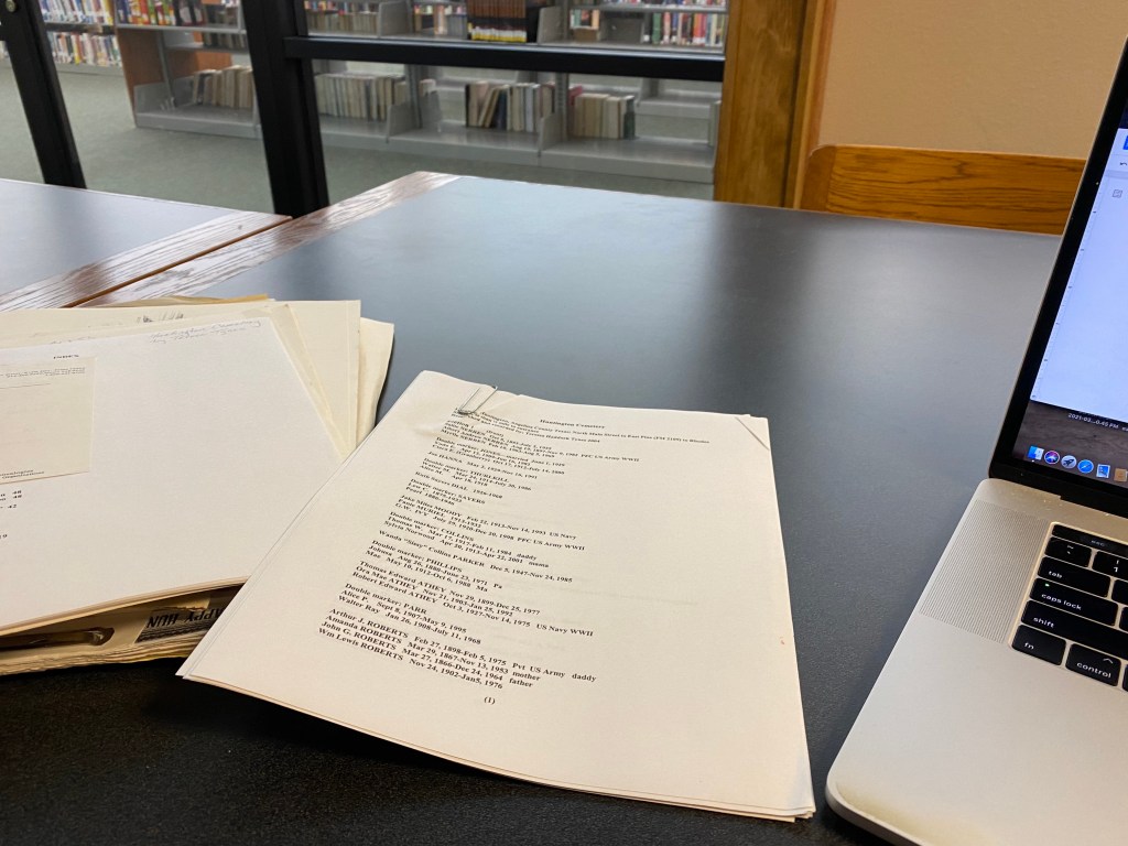 Because the Ora McMullen Genealogy Room hours aren’t compatible with my non-resident schedule, the Kurth Memorial Library team was kind enough to pull stacks of requested materials and set me up in a study room on Friday. I stayed for nearly three hours and only made it halfway through. I spent my time going through three large file folders: One on the historic role of the Masonic Lodge in Homer; one on general Homer history; and one on Huntington, Texas around the 1930s-40s. I have 347 photos from my trip, and most of them are of documents found in these folders, if that tells you anything.