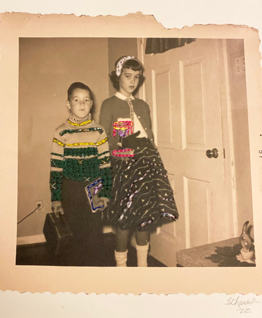 This is an embroidered vintage photo of my dad and aunt in the late 1950s in East Texas. They’re at my grandmother’s house in Homer, Texas outside of Lufkin, and looks like they’re on their way to school on a chilly day!
