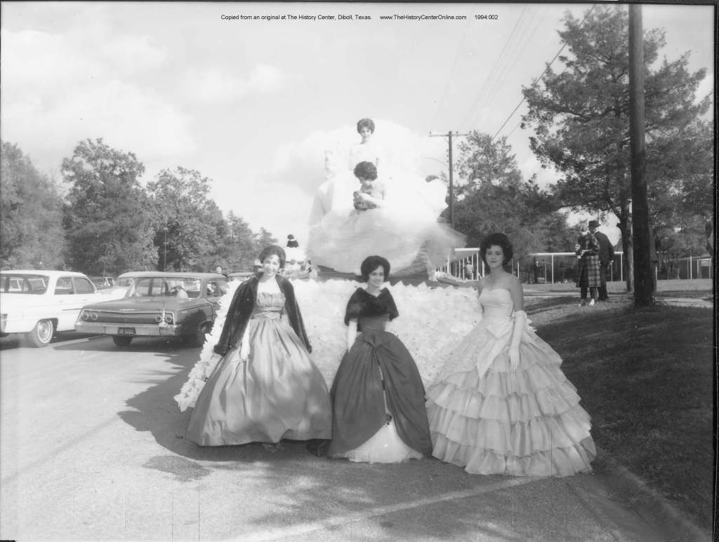 This photo is from the digital archives of The History Center in Diboll. It shows a group of young women in formal dresses, representing their town on Diboll Day at 1962 Texas Forest Festival.