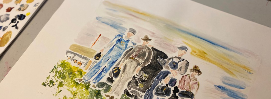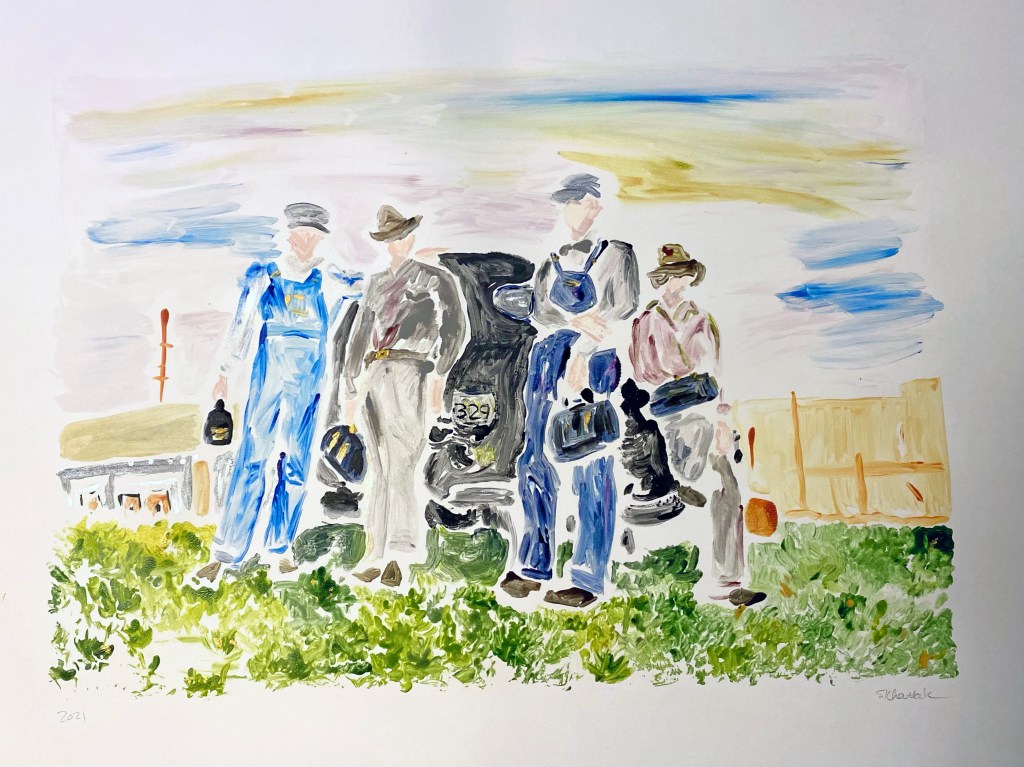 This piece is based on another Farm Security Administration photo by John Vachon. It shows four Southland paper mill workers and their car share vehicle. I like that it also shows their work gear and lunch boxes. Reminds me of how my dad used to dress for work and the lunch box he carried for so many years. My mom always packed my dad’s lunch (or dinner, if he was on an evening or overnight shift) and used to put Mrs. Baird’s fruit pies in there for dessert. So, when I see these types of lunch boxes, I think of fried pies and those big metal clasps snapping shut.