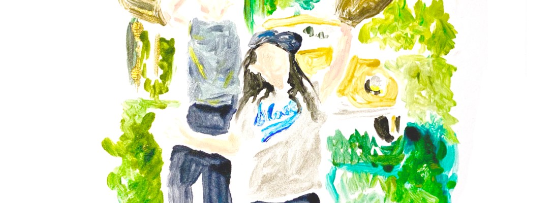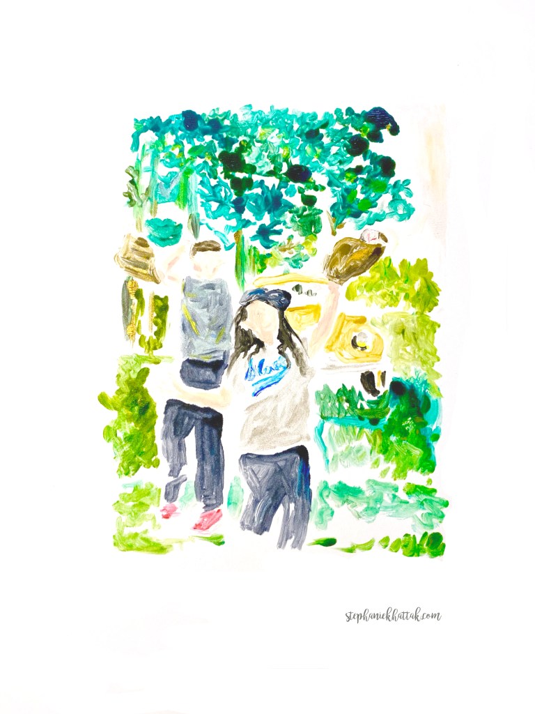 “Catch it! Got it!” By Stephanie Khattak. 12×18 Acrylic Monotype on Paper.