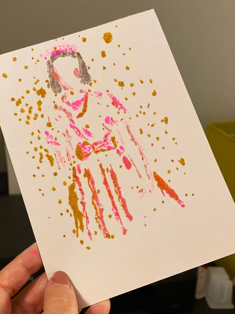 I’m still having a great time going through my art supply stash and finding new ways to use things. This piece is a magazine clipping under plexiglass, both embellished with acrylic paint to make layers. Plus gel pen on the magazine page, and a tiny bit of holographic spray paint that’s hard to see in the photo, because I’m not used to working with spray paint and am being very cautious for now.