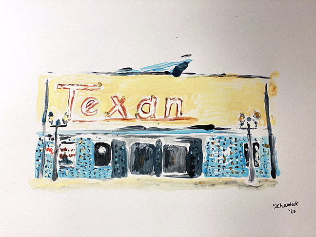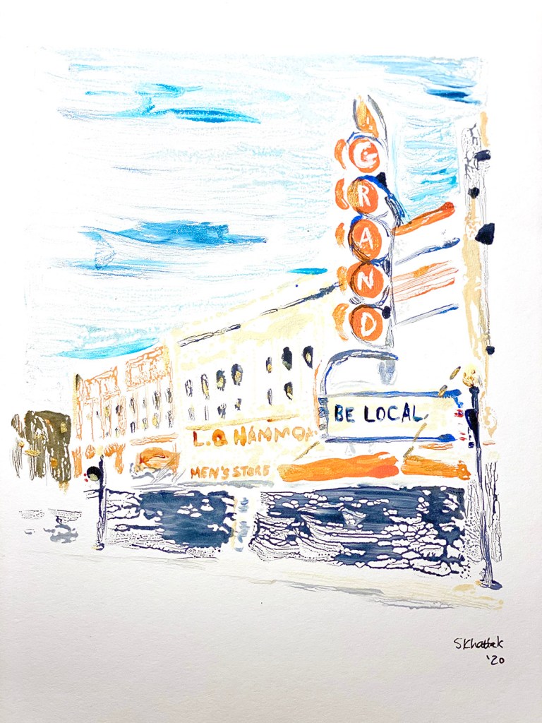The Texan Theater, Athens Texas. Monotype Print by Stephanie Khattak.Grand Theater, Paris, Texas. Monotype Print by Stephanie Khattak.